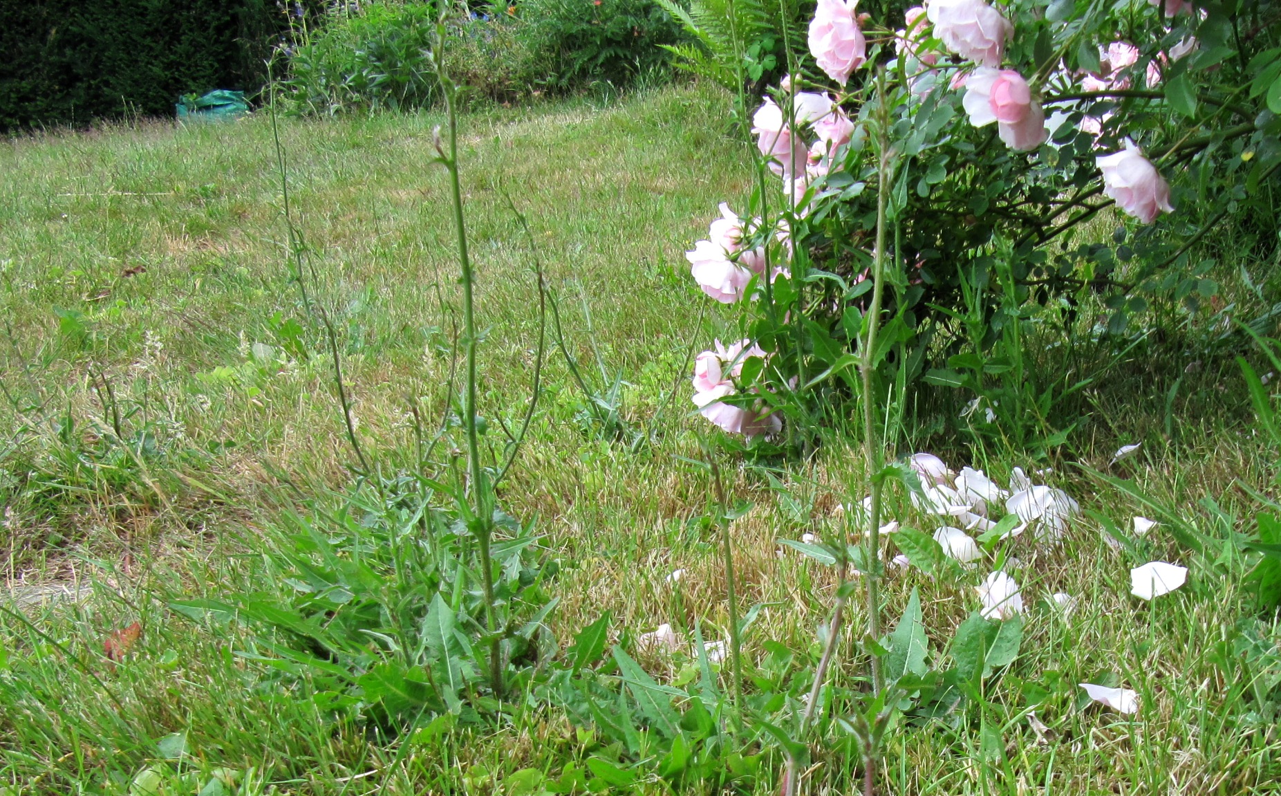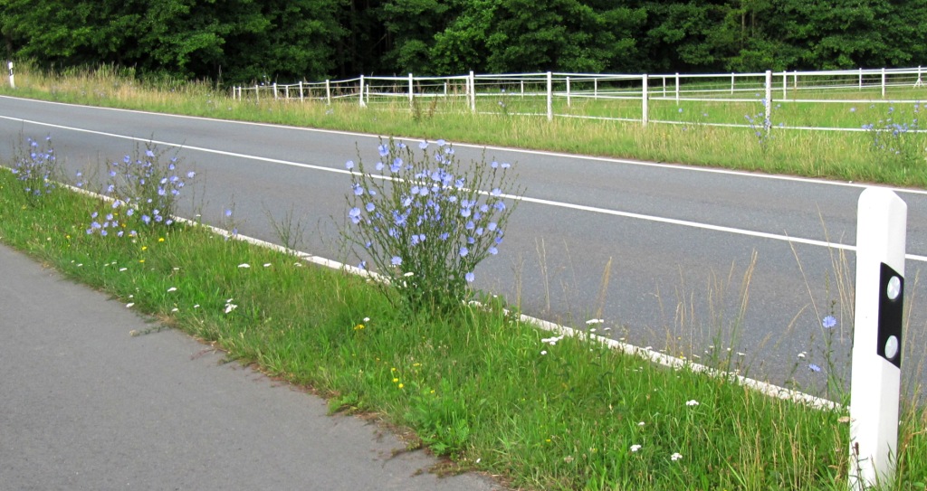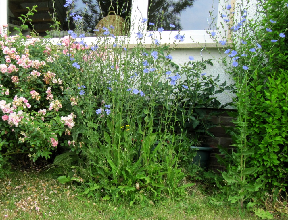 Im zweiten Jahr werden die Wegwarten wirklich groß. Inzwischen überragen sie die Rosenbüsche und erreichen fast die Höhe des 5-jährigen Hibiskusbusches. Im Freiland entlang der Bundesstraße sind sie deutlich kleiner. Ich habe den Eindruck, dass es ihnen mit der normalen Gartenerde zu gut geht. Was ich in dem Eintrag „Tomatenversteck“ noch als Scherz geschrieben habe, passiert nun wirklich. Die Wegwarten stürmen als Halbstarke durch den Garten: Im Umkreis von einigen Metern um die großen Pflanzen, sprießen ebenso borstige und gakelige Pflanzen im Minaturformat aus der Wiese und erobern sich so Stück für Stück des Gartens. Ich mag das helle, zarte Blau der Wegwarte sehr und selbst der Name, das „Warten entlang des Weges“ hat etwas lyrisches, aber sobald es regnet und ich den Rasen wieder mähen kann, werde ich dem Ausbreitungsdrang wohl doch Grenzen setzen müssen.