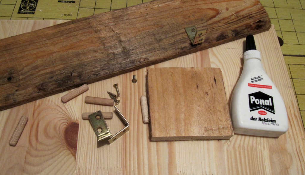 Immer mal wieder habe ich an meinem Schild weiter gebaut. Da ich echte Blumen in das Schild integrieren möchte wird die Konstruktion etwas aufwändiger als das Original aus dem Film. Auch der Anstrich mit Wetterschutzfarbe dauert seine Zeit: Zweimal von jeder Seite, also 4 Tage an denen ich zum Streichen in den Keller gehe. Anfangs wollte ich die verschiedenen Teile des Schildes mit Winkeln aus Metall zusammen halten. Das hat jedoch den Nachteil, dass diese rosten können und ich zudem in das sorgfältig gestrichene Schild wieder Löcher bohre. Irgendwie gefiel mir diese Vorstellung nicht: Erst baue ich ein Schild für Wildblumen und stelle mir einen naturnahen Garten dabei vor, aber dann rostet mir das Schild vor lauter Metall-Schrauben vor sich hin. Das passt nicht zusammen. Nun habe ich an fast allen Stellen die Winkel durch Holzdübel ersetzt. Auch wenn ich dafür genauso Löcher bohren musste, wie für die Schrauben. Ich werde also noch einmal zur Farbdose greifen müssen.