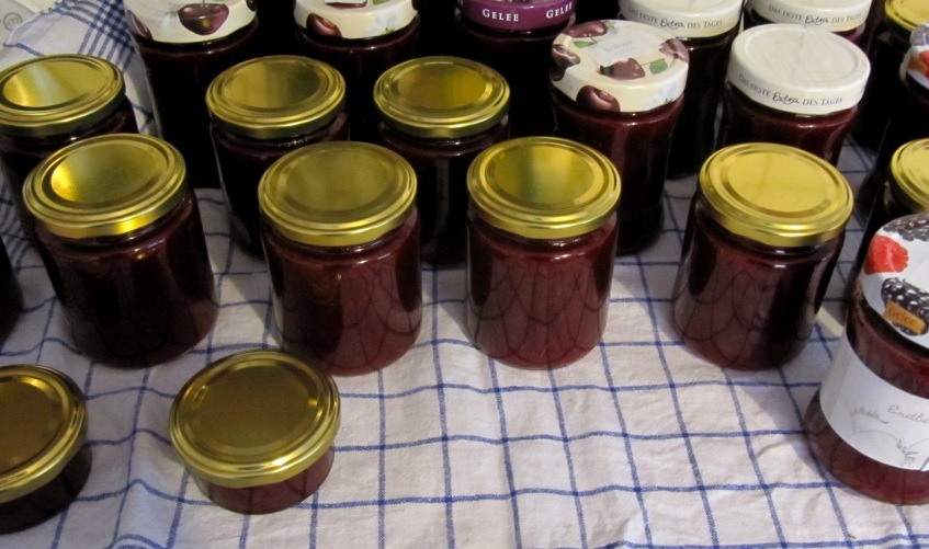 Zum Abfüllen nehme ich – so lange es nur für mich ist – zum großen Teil gebrauchte Gläser. Ich habe mir aber inzwischen auch eine Kiste neue Gläser gekauft. Ich war überrascht wie riesig die Auswahl an Formen und Größen ist. Ich habe mich dann schließlich für ein niedriges Glas entschieden, aus dem man die Marmelade restlos heraus bekommt. Es ist einfach zu Schade, wenn die selbst gemachte Marmelade in Ecken in Rillen des Glases hängen bleibt. Außerdem habe ich ein „erfrischend altmodisches“ Glas entdeckt. Ich habe den Eindruck dass „früher“ (also die Zeit, die für mich früher ist) Marmelade einfach in Gläsern war und nicht erst eine internationale Maarketing-Abteilung über Farben und Formen entschieden hat.