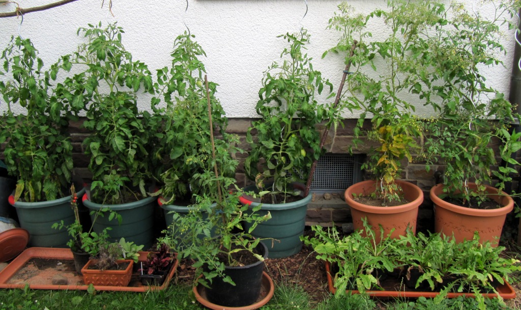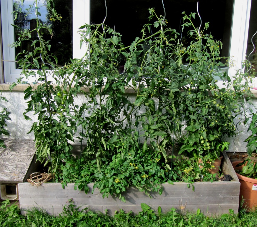 Auch wenn es immer noch keine roten Tomaten gibt, entwickeln sich alle Pflanzen sehr gut. Das ist wohl der rechte Moment für eine Zwischenbilanz: Das Wachstum ist abgeschlossen und die Kräutfäule hat noch nichts dahin gerafft.