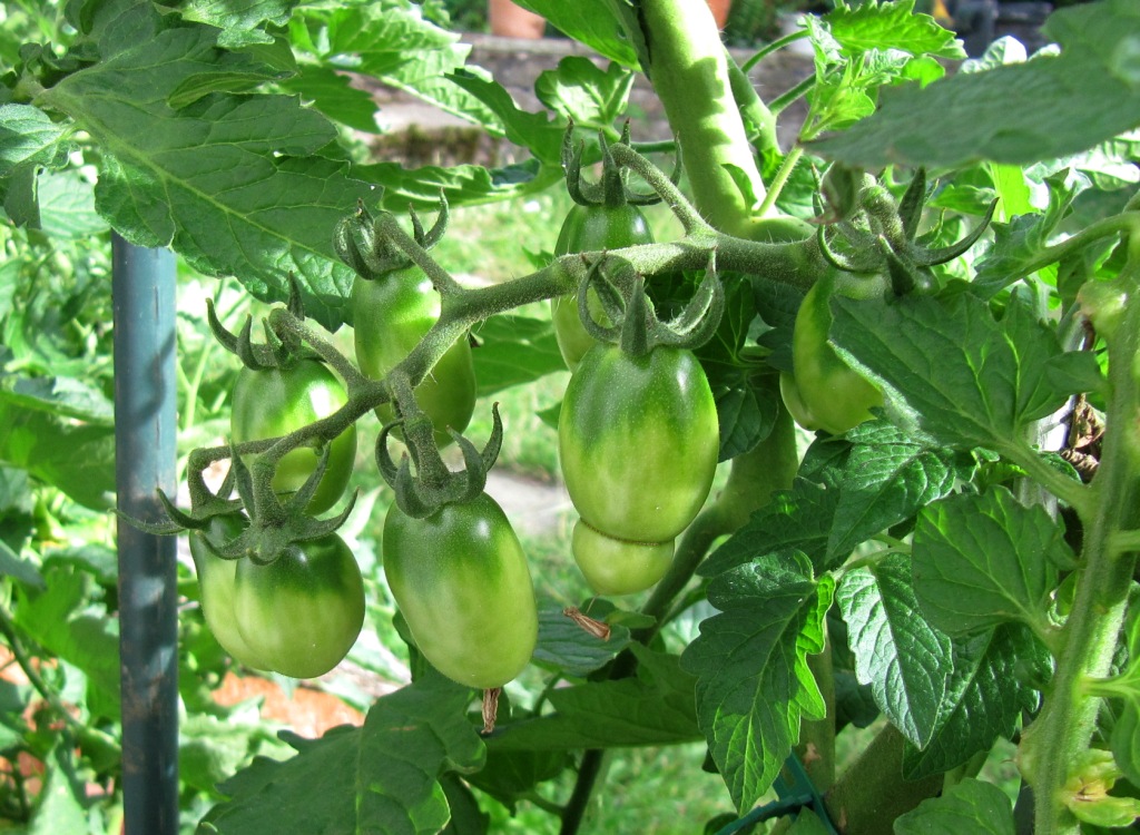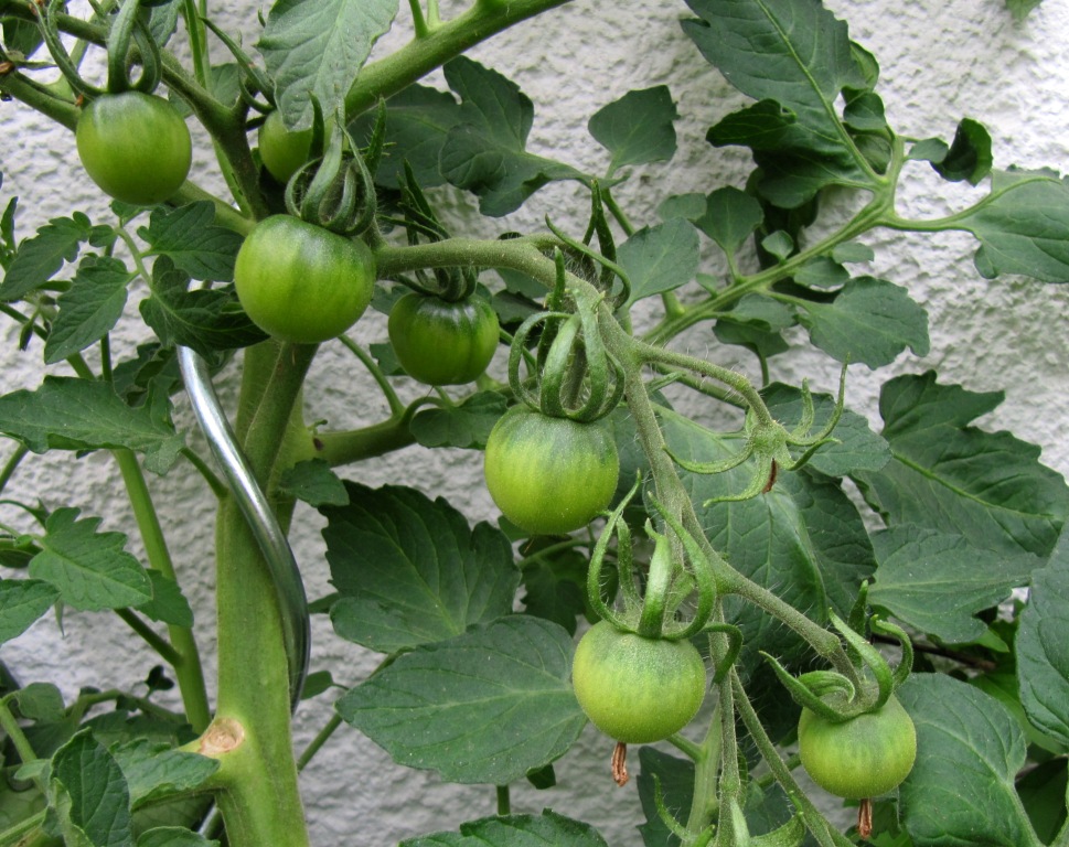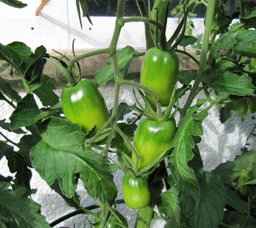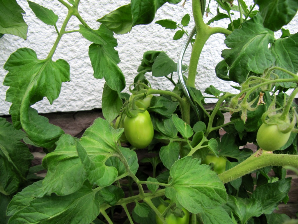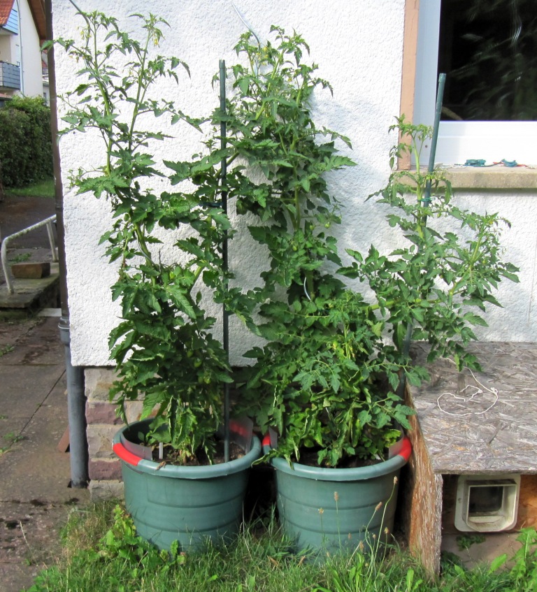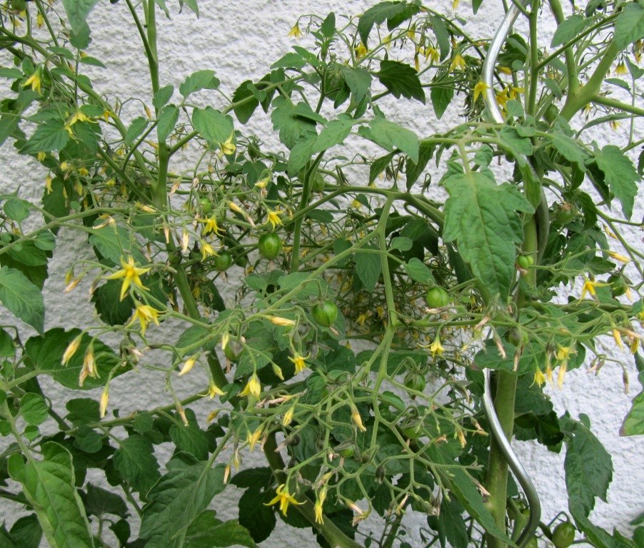 Von den Stabtomaten sind Rio Grande die kleinsten Pflanzen. Sie haben mittlerweile eine Reihe von grünen Tomaten und ich bin gespannt, wie die Tomatensoße aus selbstangebauten Mark-Tomaten schmecken wird.