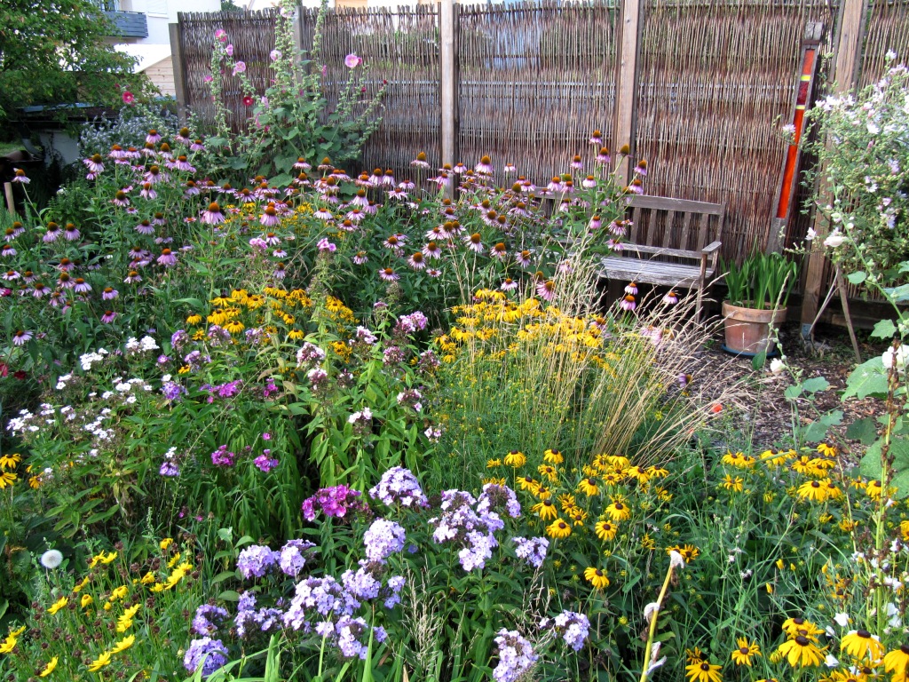 Das Staudenbeet ist die wahre Königsdisziplin des Gärtnerns! Ich versuche mich nun seit 5 Jahre daran und entdecke jedes Jahr völlig neue Herausforderungen. In diesem Jahr wurde mir klar, dass es nicht nur darum geht die Höhe der Pflanzen zu bedenken und was wann blüht, sondern auch wer wen verdrängt. Wenn ich in zwei Jahren nicht ausschließlich Echinacea und Mohn im Staudenbeet haben will, werde ich dort immer wieder umbauen und ergänzen aber auch deutlich begrenzen müssen. So schön und beeindruckend Echinacea auch ist, sie hat die Trollblume und den Rittersporn fast völlig überwuchert. Ein gelungenes Staudenbeet ist somit zugleich auch eine der künstlichsten Flächen des naturnahen Gartens. Natur und Garten sind durchaus zwei verschiedene Dinge. Ich versuche so wenig wie möglich einzugreifen und den Waldmeister oder die Glockenblume dort wachsen zu lassen, wo sie sich wohl fühlen, aber so wie ich regelmäßig den Rasen mähe, muss ich auch im Staudenbeet eingreifen und die eine Pflanze zügeln und die andere besonders unterstützen.