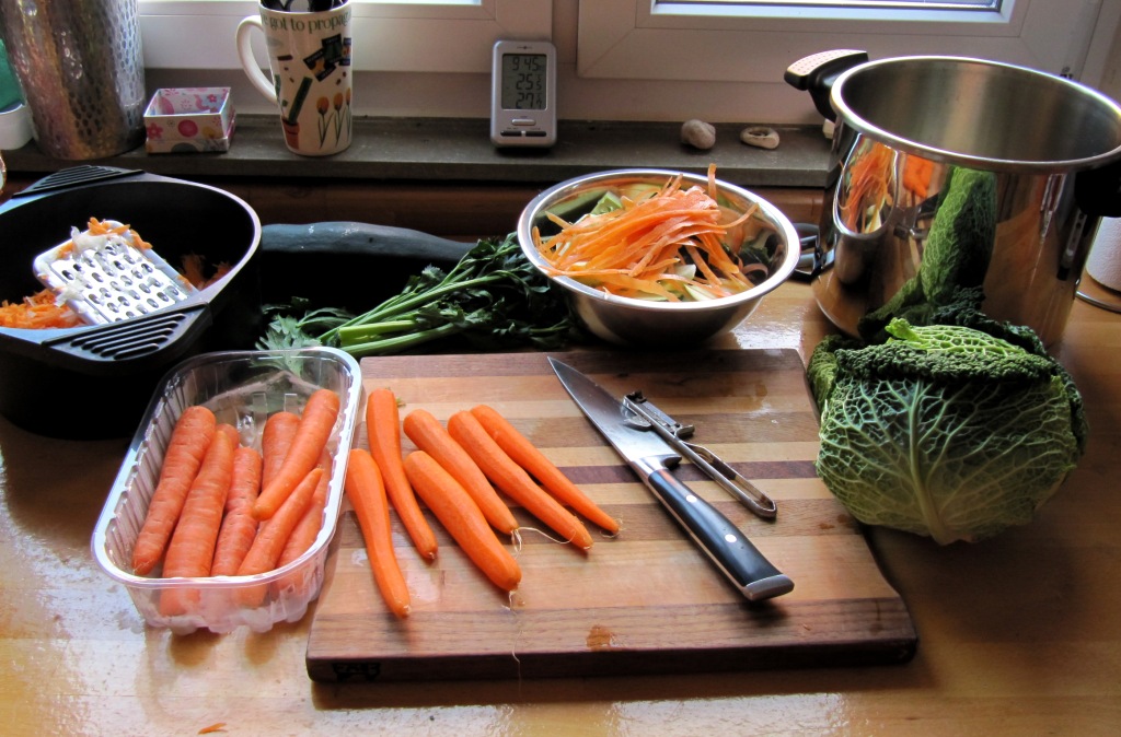 Zur Zeit könnte ich zwei Mal die Woche Zucchini kochen. Aber so eine Zucchini kann – spätestens im Wiederholungsfall – ganz schön langweilig schmecken. Was gibt es also dazu? Ich rette mich schließlich, indem ich das BARF (Biologisch Artgerechtes Roh-Futter) für den Hund vorbereite und für die Menschen allerlei Gemüse hinzukaufe, das jetzt gar keine Saison hat, aber nötig ist um aus Zucchini eine Gemüsesuppe herzustellen.