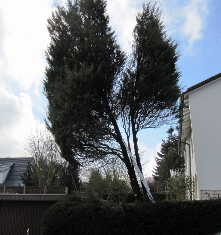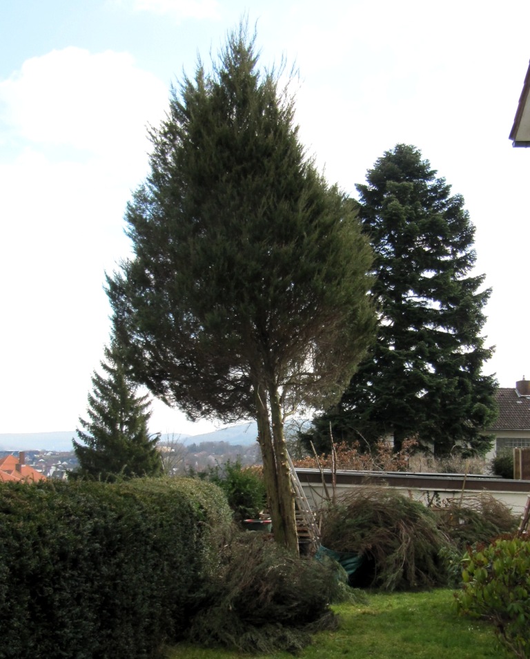 Was hätte ich getan, wenn ich früher gewusst hätte, dass der Baum ein Wacholder ist? Wie lässt sich ein Baum stützen, wenn er als Ganzes schief ist? Lässt sich selbst jetzt, nachdem ich die Seitenäste bis in drei, vier Meter Höhe entfernt habe, noch irgendetwas retten? Es ist immer wieder erstaunlich, wie sich die eigene Einstellung verändert, wenn man mehr über das Thema erfährt. Ganz gleich ob es nun ein schiefer Baum oder etwas ganz anderes ist.
