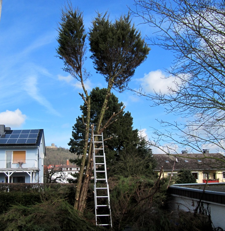 In etwa 5 Meter Höhe wird die Sache langsam wacklig. Ich hatte einige größere Äste nicht direkt am Stamm abgesägt, damit ich mich, wie an einer Kletterwand festhalten kann. Aber selbst dies reicht mir irgendwann nicht mehr. Gerade als ich überlege, wie ich denn nun weiterarbeiten kann, kommt mir ein Nachbar zu Hilfe und gemeinsam ist es kein Problem die letzten 2 Höhenmeter zu bewältigen und den Stamm dann auf den Hof zu tragen.