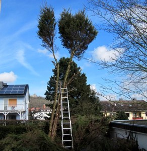Die Situation erinnert mich an einen Vortrag von Veit Lindau, den ich vor einiger Zeit gehört habe. In dem Vortrag ging es um das Thema „Sichtbarkeit“: Erst dann, wenn man mit seinem Thema für andere Menschen sichtbar ist, erreicht man seine Ziele, so lautet ganz grob zusammengefasst der Gedanke von Veit Lindau. Ich hätte tage- und wochenlang in meinem Kämmerchen darüber grübeln können, wie ich denn bloß diesen Baum fälle, und wäre keinen Schritt weiter gekommen. Indem ich mein Vorhaben sichtbar gemacht habe – immerhin habe ich den ganzen Samstagvormittag direkt an der Straße auf der Leiter gestanden und Äste gesägt – haben andere die Chance bekommen, mich zu unterstützen. Zu meinem Glück hat der Nachbar die Chance wahrgenommen, sonst säße ich vielleicht immer noch in 5 Meter Höhe fest.
