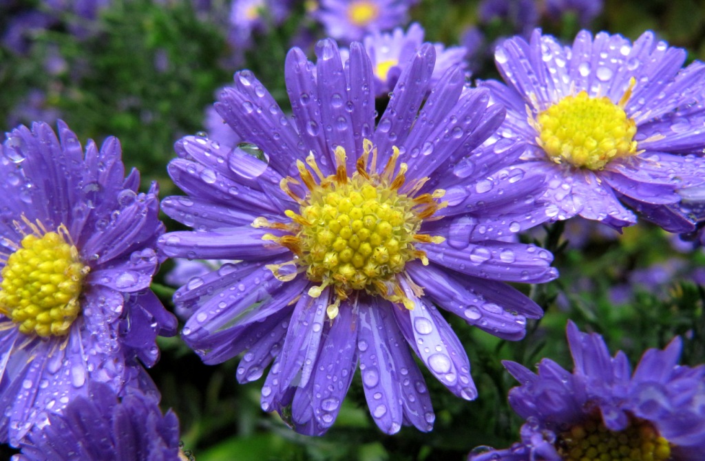 Heute Morgen waren die Astern noch nieselregennass, aber nun ist es ein richtig blitzeblauer Herbsttag geworden. Ich frage mich, wo all die Beschreibungen einer depressiven und traurigen Herbstzeit herkommen. Sind diese Dichter nie durch einen bunten Herbstwald gelaufen?