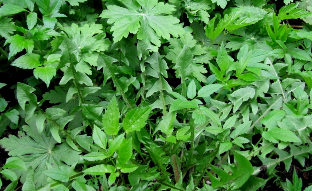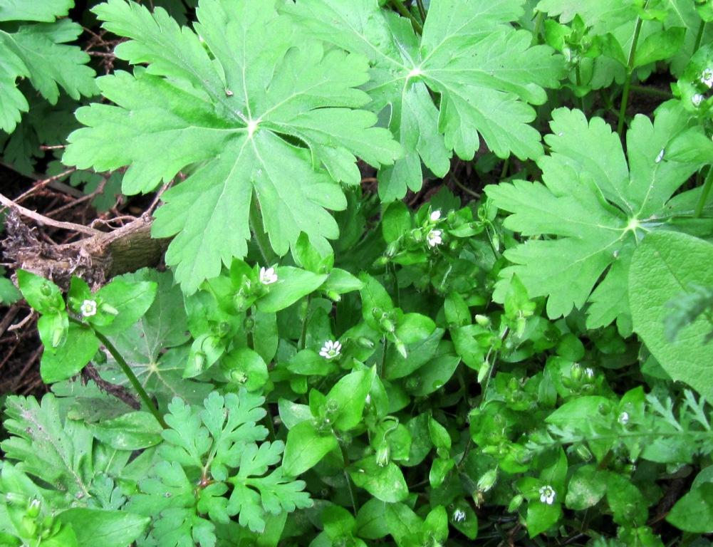So langsam kommt der Giersch nun wieder aus dem Versteck gekrochen. Aber inzwischen muss er sich nicht nur gegen den Storchenschnabel durchsetzen. Mit Vogelmiere und Löwenzahn haben noch weitere Wucherer ihren Weg ins Obstbeet gefunden. Sie allesamt wuchern nun um die Wette. Löwenzahn lässt sich leicht ausstechen. Vogelmiere lässt sich als Salat verwenden. Den Storchenschnabel habe ich selbst angelockt.