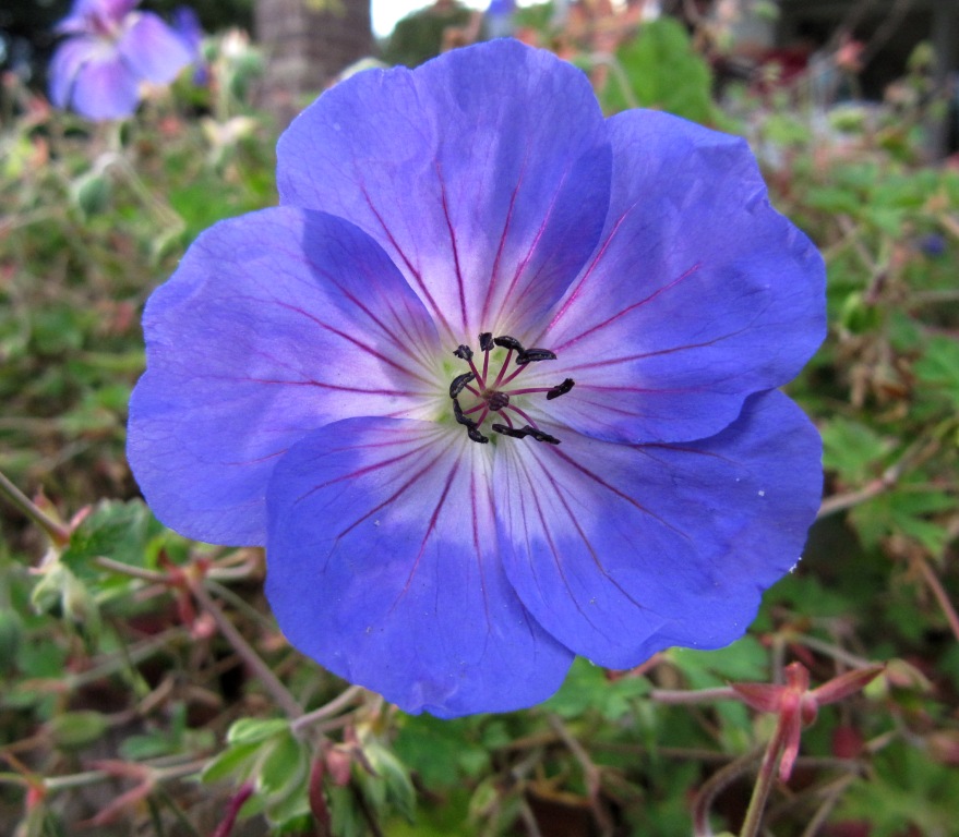 Tolle große ultramarin-farbene Blüten: Geranium pratense z.B. „Brookside“ oder „Johnsons Blue“.