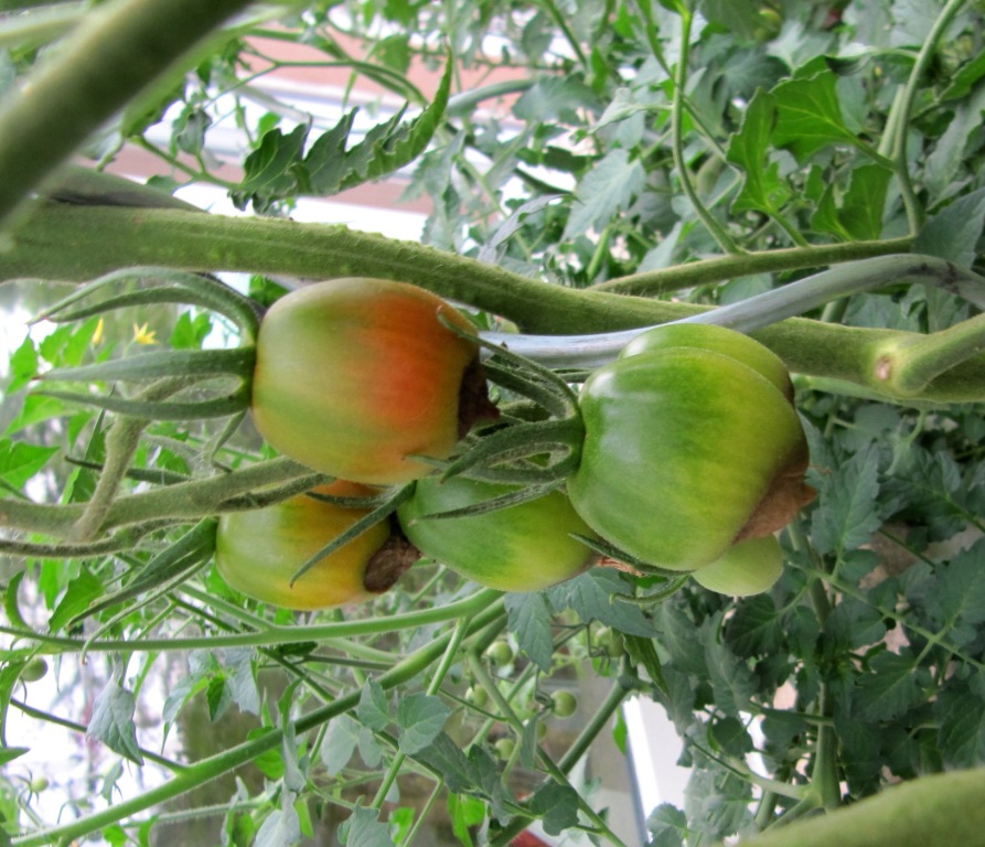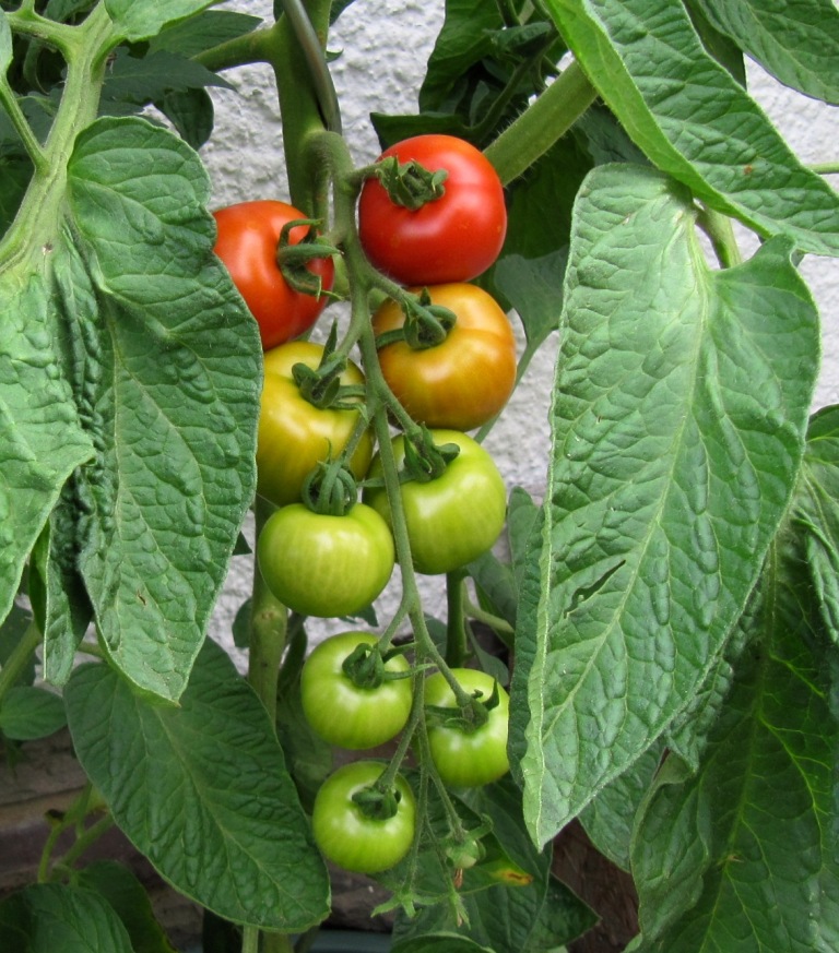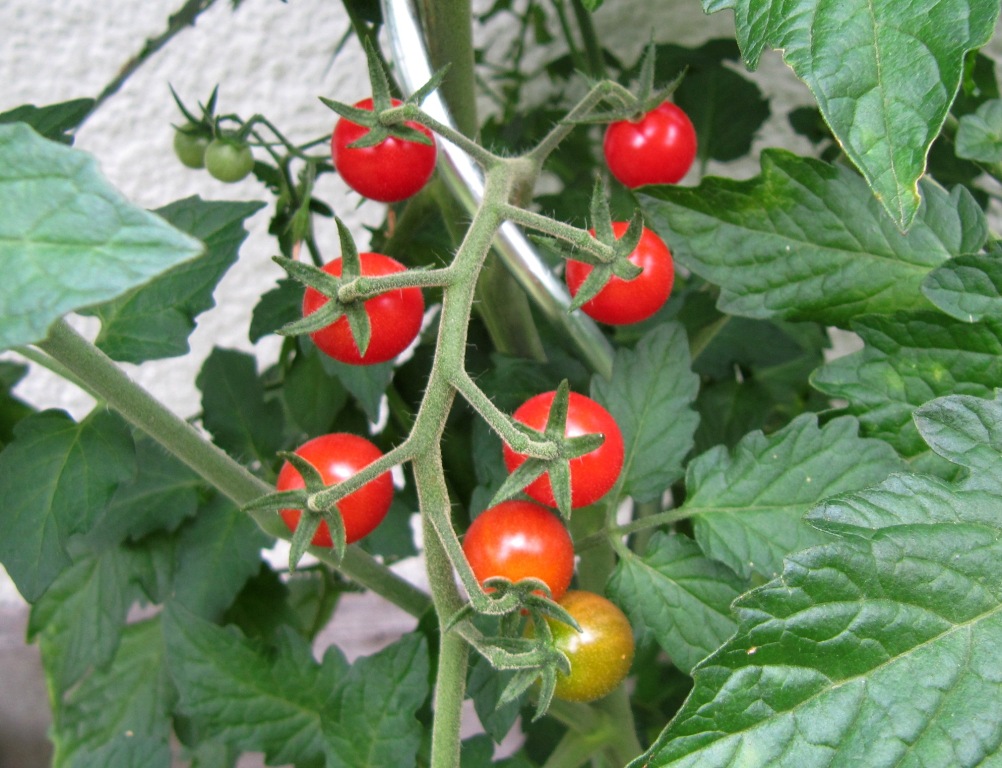 In der regnerischen ersten Hälfte des Sommers habe ich die Tomaten wenig gegossen. Vielleicht war das ein Fehler, da die Töpfe und die Tomatenkiste ja extra so platziert sind, dass sie wenig Regen ab bekommen.