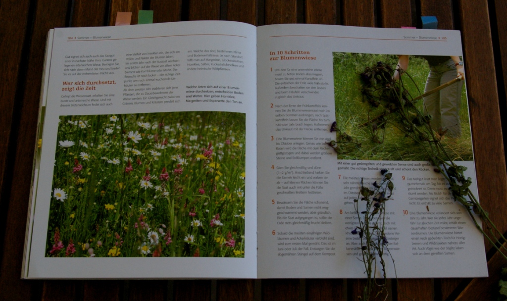 Mir hat am besten das Kapitel zur Blumenwiese gefallen. Die recht große Rasenfläche unseres Gartens ist gerade von ganz alleine dabei sich in eine Blumenwiese zu verwandeln. Ich konnte für mich noch einige sinnvolle Tipps aus dem Kapitel mitnehmen und habe gleich gestern von einem Spaziergang einige Stängel halbverblühte Wildblumen mitgebracht.