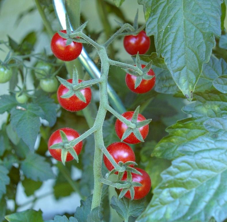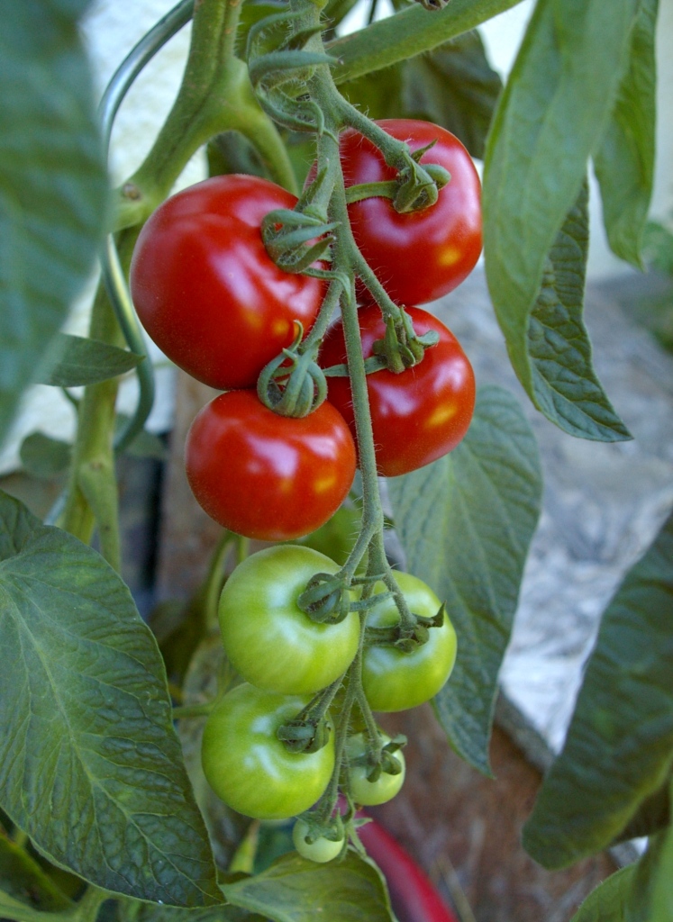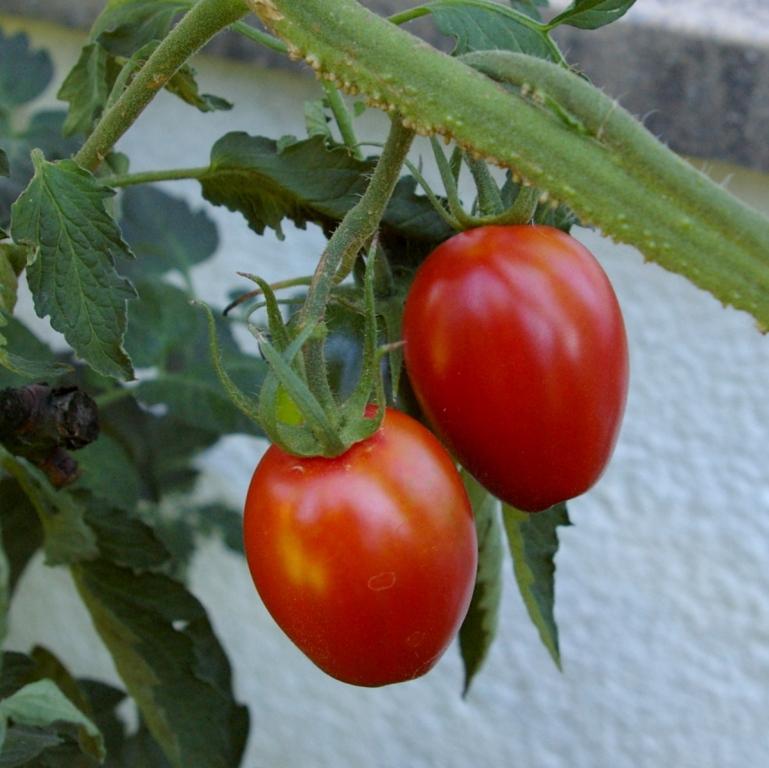 Ich habe den Eindruck, dass der Gartenkalk das richtige Mittel gegen die Blütenendfäule war. Die Blätter sind wieder dunkelgrüner und neue Fruchtansätze der roten Zora sehen gesund aus. Matina hat sich insgesamt bisher als pflegeleichter und problemloser gezeigt. Auch wenn die rote Zora mit ihren länglichen, leicht pinken und recht süßlichen Früchten meine aktuelle Lieblingssorte ist, so werde ich doch überlegen, im nächsten Jahr mehr auf Matina zu setzen. Das hätte auch den Vorteil, dass ich keine 2,50 Meter hohen Spiral-Stangen mehr brauche.