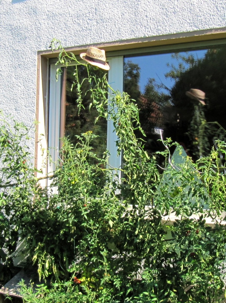 Eine meiner Tomaten ist mittlerweile über 2 Meter hoch – natürlich eine Rote Zora, wer sonst strebt in solche Höhen? – und ich habe ich zur Probe meinen Sonnenhut geliehen, aber ich habe den Eindruck, er hilft ihr nur wenig.