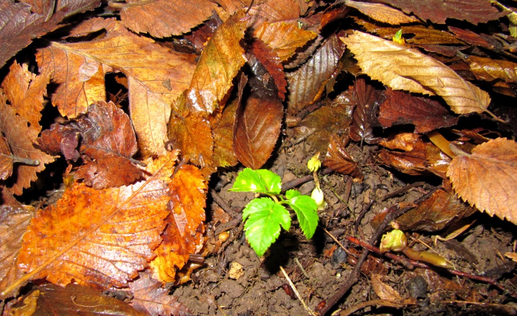 Während ich so das Laub reche – eine wirklich interessante Mischung aus heutiger Kontemplation und morgigem Muskelkater – sehe ich, dass unter der Hainbuchenhecke viel welkes Laub liegt. Na klar, obendrüber ist die Hecke und wo soll das Laub sonst hin. Im restlichen Garten liegen mal da und mal dort ein paar Blätter. Da wir sehr wenige Bäume im Garten haben, ist Laub fast so etwas wie Mangelware und es gab schon Jahre, in denen ich zum Laubsammeln in den Wald gefahren bin, um wenigstens die Rosen abdecken zu können. Im Garten liegt also recht wenig Laub, aber entlang der Buchenhecke liegt eine verlässliche Schicht. Als ich anfange dieses Laub zusammen zu kehren, entdecke ich darunter frische Triebe meines „Lieblingsunkrautes“ Giersch.
