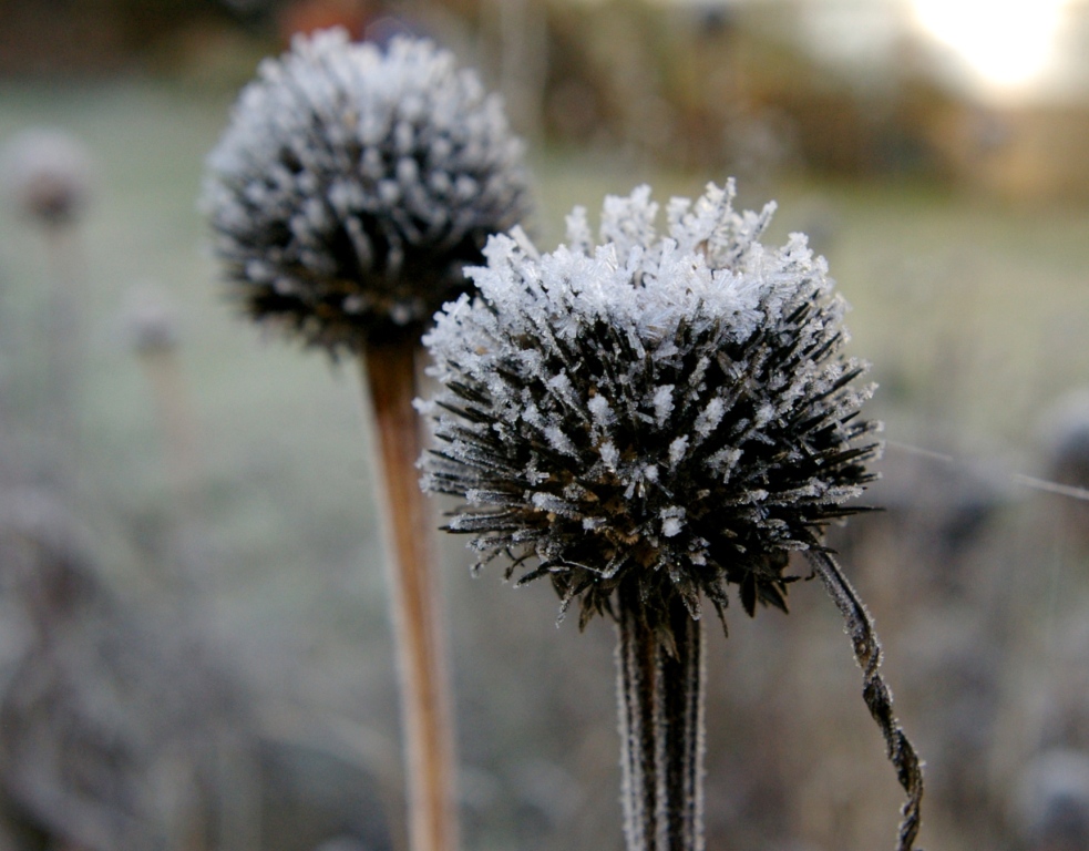 Jedes Jahr frage ich mich aufs Neue, wo in den Januar-Gartenzeitschriften all die Fotos von romantisch überfrorenen Gräsern, Bäumen und verwelkten Blütenständen herkommen. Ich finde zwar, dass „verwolkene Blütenstände“ viel besser zu „romantisch überfrorene Gräser“ passt, aber das muss ich wohl mit dem Herrn Duden verhandeln und nicht mit den Gartenzeitschriften. Aber ganz egal, ob nun verwelkt oder verwolken, am Sonntag war tatsächlich genau der eine Tag im Winter, an dem solche Fotos gelingen. Ich stelle mir vor, wie nun allüberall die Gartenzeitschriftfotoreporter ausschwärmen, um reichlich Winterfotos einzusammeln und sich bereits jetzt für den nächsten schneefreien Winter zu bevorraten. Zumindest im Bereich des eigenen Gartens und für die kurze Weile, die es dauert, bis ich ohne Handschuhe durchgefroren bin, schließe ich mich ihnen an.