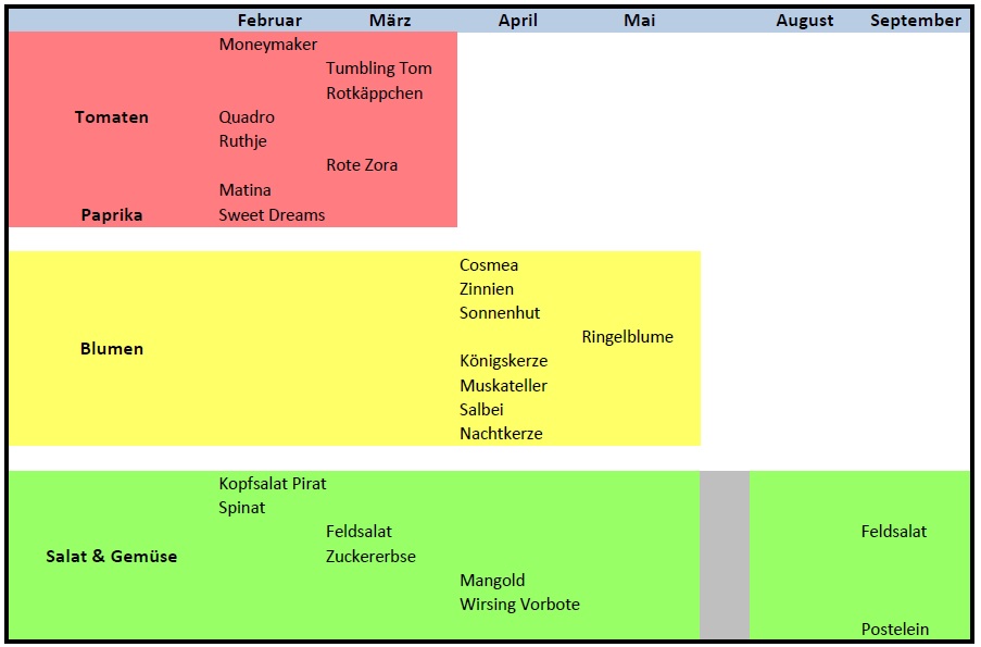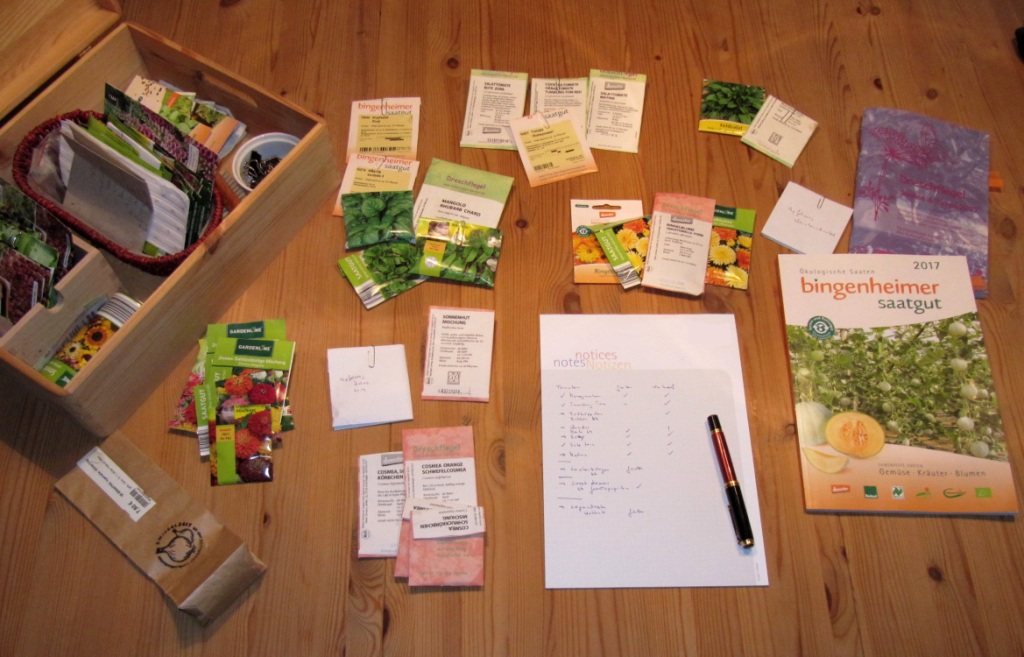 Immer wieder ist es mir passiert, dass ich am Jahresanfang genau weiß, was ich wann säen will und im Laufe der Monate den Überblick verliere. Ich sortiere das Saatgut und bilde auf dem Schreibtisch Gruppen für Blumen, Gemüse und Salat. Wenn ich dann mit dem Planen fertig bin nehme ich die ersten Sorten und fange an auszusäen. Alles andere Saatgut kommt wieder in die Kiste – und zumindest der Zeitplan gerät in Vergessenheit.
