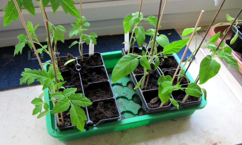 Inzwischen entwickeln sich alle Sämlinge recht gut. Die frühen Sämlinge sind schon richtig groß geworden und bereits das erste Mal umgetopft. Meine wichtigsten Utensilien sind zurzeit Büroklammern und Schaschlik-Spieße. Inzwischen sieht man auch schon gut die unterschiedlichen Blattformen bei der „kartoffelblättrigen“ Matina und der „normalen“ Quado.
