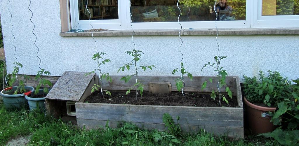 An diesem Wochenende kommen endlich die restlichen Tomatenpflanzen ins Beet! Vor 14 Tagen habe ich versuchsweise die ersten Pflanzen gesetzt und nun kommen die restlichen Pflanzen dazu. Als Standorte verwende ich das, was sich in den letzten Jahren bewährt hat: Eine selbstgebaute Holzkiste (200 × 50 Zentimeter) an der Südwestwand des Hauses und Kübel (50 Zentimeter Durchmesser) an der Südostseite des Hauses. Besonders die Südostseite ist sehr trocken – dort wächst nicht einmal Unkraut – so dass ich auch ohne Regenschutz gute Ergebnisse erziele.