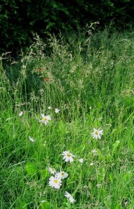 Plötzlich war der Rasen nicht mehr die Fläche, die ich halt mähen muss, damit der Weg zum Bauerngarten frei ist. Auf einmal wurde klar, dass diese Fläche selbst auch etwas zu sagen hat. Sie ist quasi ein riesiges Beet in dem normalerweise eine Monokultur von Gräsern wächst. Schon oft habe ich darüber nachgedacht eine Blumenwiese zu säen. Sofort kommen dann als erste Gedanken „Wo ist ein guter Platz dafür?“ oder „Welche Wildblumen passen zusammen und wo bekomme ich sie her?“. Doch nun zeigt sich, dass die Blumenwiese längst da ist. Ich muss sie nur einmal wachsen lassen anstatt immer wieder mit dem Rasenmäher über die aufkeimende Vielfalt zu fahren.