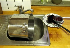 Als ich vor einigen Jahren angefangen habe, Marmelade selbst zu kochen, habe ich einfach den größten Topf genommen, Obst & Zucker hineingeschüttet und alles aufgekocht. Im Prinzip ist es genau richtig es so zu machen, nur war der Topf dann oft randvoll, es sprudelte und spratze nur so vor sich hin und ich habe noch Tage später die letzten Marmeladenflecken entdeckt. Daher habe ich dann irgendwann das Internet durchsucht und mich für einen sogenannten Jumbo-Topf entschieden. Natürlich gibt es zig verschiedene sehr große Töpfe und zu jedem einzelnen auch noch zahlreiche Kommentare. Bei der Diskussion der verschiedenen Eigenschaften von Volumen über Stabilität bis hin zum Aussehen, wird meiner Meinung nach ein wesentliches Kriterium übersehen: Man muss den Topf nach dem Benutzen wieder reinigen. Wenn also das Aufräumen hinterher so lässig sein soll wie das Kochen der Marmelade, dann muss der Topf ins Spülbecken passen. Das klingt banal und dennoch ist mir erst heute klar geworden, was ich für ein Glück hatte, den Topf nicht eine Nummer größer gewählt zu haben!