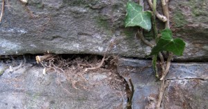 Lange habe ich mich über die hübschen Efeuranken entlang der kleinen Natursteinmauer gefreut. Zu lange! Als ich die verblühten Stockrosen abgeschnitten habe, wurde schlagartig deutlich, dass der Efeu nicht nur entlang der Mauer wächst, sondern auch durch sie hindurch und ganz nebenbei auch den Putz des angrenzenden Wohnhauses unterwandert hat. Wenn ich noch etwas warte – so lange wird das wahrscheinlich gar nicht dauern – kann ich den Efeu im Wohnzimmer als Zimmerpflanze begrüßen, die ich niemals gießen muss, weil sie ihre Wurzeln im Garten hat. Das wäre echt ein innovatives Konzept für Zimmerpflanzen.