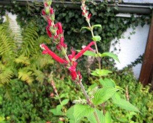 Ich schaue trotzdem, ob es nicht noch etwas gibt, das sich gegen diesen Trend stellt und entdecke den etwas in Vergessenheit geratenen Ananassalbei. Im Laufe des Herbstes hatte ich oft nach ihm geschaut und war jedes Mal etwas enttäuscht, dass es „nur“ ein grüner Busch ist. Nun, da das Wetter so kühl geworden ist, dass ich nicht mehr jeden Tag im Garten bin, steht der Ananassalbei in voller Blüte. Einige Internetseiten schreiben, dass er bereits im Spätsommer blüht, doch in meinem Garten blüht der Ananassalbei ab Mitte November. Jetzt ist die Zeit das Ananassalbei! Was auch immer diese Pflanze dazu bewegt, fast ein ganzes Jahr zu wachsen und erst jetzt zu blühen. Für die nächsten Tage ist bereits der erste Frost angesagt. Ananassalbei ist nicht frosthart und ich werde ihn in die helle Garage stellen. Vor einigen Wintern hatte ich ihn im Treppenhaus stehen und er hat bis zum Frühjahr geblüht. Mittlerweile ist der Kübel zu groß, um ihn das Treppenhaus herauf zu zerren.