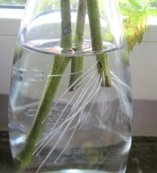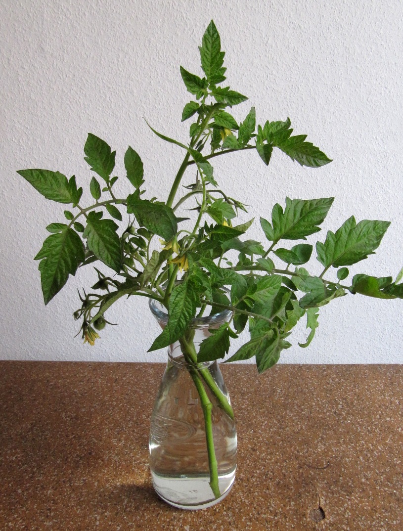 Möglichst spät in der Tomatensaison lasse ich zwei Seitentriebe stehen. Als sie etwa 15 Zentimeter lang sind, breche ich sie heraus und stelle sie in eine Vase, damit sie Wurzeln ziehen. Die Tomatentriebe fühlen sich auf dem Fensterbrett sichtlich wohl, entwickeln Wurzeln und wachsen sogar etwas weiter. Ich gehe allerdings davon aus, dass sich Tomaten nicht den ganzen Winter über als Hydrokultur halten lassen und pflanze die bewurzelten Triebe in Blumentöpfe. Dieser Schritt funktioniert dann leider nicht. Die Pflanzen halten sich zwei Wochen tapfer, und dann gehen sie ein. Ich werde den Versuch mit Hydrokultur in diesem Herbst wiederholen und erst im Frühjahr 2019 in Töpfe setzen.