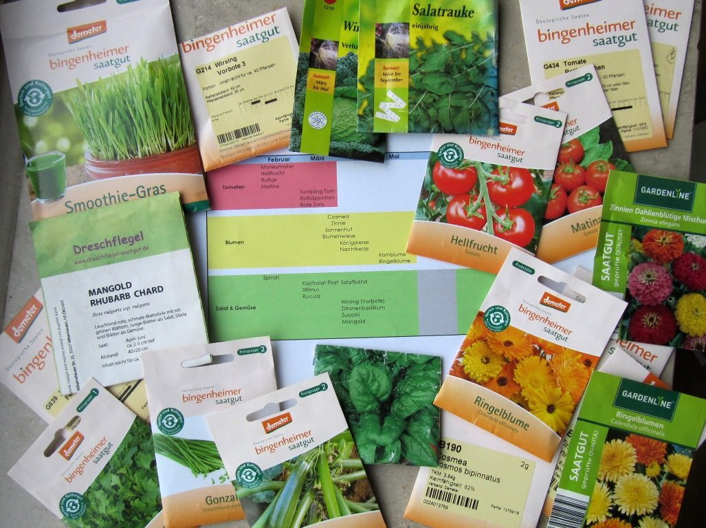 Ich räume den Schreibtisch frei und versammele sämtliche Vorräte und einen Extrastapel mit den neu erworbenen Schätzen. Saatgut ist wahrlich ein Schatz. Einer, der zu wenig gewürdigt wird, steckt in ihm doch die Ernte des restlichen Jahres und in früheren Zeiten auch das Wohl und Wehe der gesamten Familie. Mit dem Kauf von samenfesten Sorten, möchte ich dazu beitragen, dass Saatgut frei von Markenrechten und Geschäftsinteressen bleibt. Nur mit samenfesten Sorten kann ich im nächsten Jahr aus der eigenen Ernte wieder neue Pflanzen ziehen oder auch dem Nachbarn von meinen Sorten weitergeben. Das ist mir wichtig, damit Vielfalt und regionale Arten erhalten bleiben. Außerdem möchte ich nicht – selbst nicht auf den kundenfreundlichsten! – Konzern angewiesen sein, ob er meine Lieblingssorten noch für wirtschaftlich sinnvoll erachtet oder ob es sie eines schönen Tages plötzlich nicht mehr gibt.