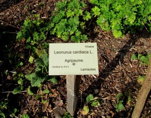 Nach ein paar Schritten stehe ich mit einem großen Fragezeichen im Kopf vor einem Schild „Leonurus cardiaca / Agripaume“. Bisher konnte ich mich oft damit retten, dass ich halt weiß, wie eine bestimmte Pflanze aussieht. Den mir unbekannten lateinischen Namen wie Plantago Lanceolata (Spitzwegerich) nehme ich dann eher als Bonus wahr. Aber nun bin ich in einem fremdsprachigen Kräutergarten und kann die Schilder in keiner der beiden Sprachen lesen, und auch die Pflanzen erkenne ich zu dieser Jahreszeit nicht alle an ihren ersten wenigen Blättern. Vielleicht ist ja das kleine Blättchen rechts neben dem Schild schon Leonurus cardiaca oder ist es das, was für mich wie Boretsch aussieht? Es lohnt sich also mehr lateinische Pflanzennamen zu kennen. Dann könnte ich vielleicht bereits jetzt im März lernen wie das Echte Herzgespann aussieht.