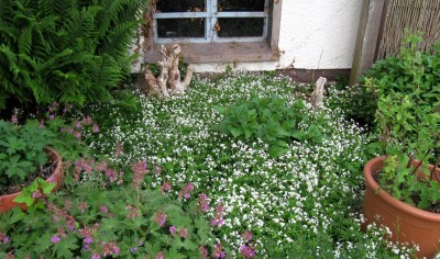 Vor einigen Jahren habe ich zwei winzige Töpfchen Waldmeister (Galium odoratum) geschenkt bekommen. Ich hatte sie in einen vergrabenen Eimer gepflanzt, damit sie mir nicht verloren gehen und ich im nächsten Frühjahr gezielt danach suchen kann, wenn sich Unkraut oder die angrenzenden Storchenschnäbel ausgebreitet haben. Welch ein Irrtum! Von allen wüchsigen Pflanzen in dieser Ecke des Gartens breitet sich nicht so schnell und vehement aus wie der Waldmeister. Und das obwohl mit Pfefferminz, Lampionblume und den erwähnten Storchenschnäbeln kräftige Wucherer zur Verfügung stehen.