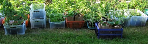 Die Pflanzenbörse im Botanischen Garten ist nun im dritten Jahr in Folge eines meiner gärtnerischen Highlights. Anstatt der Gartenverkehrsschilder habe ich mich dieses Jahr mehr auf Sommerblumen konzentriert. Die vielfache Folge aus Aussaat, Pflege, Umtopfen, weitere Pflege der verschiedensten Vorzuchten beschäftigt mich nun seit Mitte Februar. Erst waren es die Tomaten (für mich und einige Büro-Kollegen) und dann ging es direkt mit den Sommerblumen für die Pflanzenbörse und dem Salat für den eigenen Garten weiter. Etwa im Wochenrhythmus dachte ich abwechselnd „Das ist viel zu viel“ und „Du hast schon wieder zu wenige Zinnien“. Tatsächlich hat nicht alles so funktioniert, wie geplant, aber als ich die Pflanzen nun zusammensammele, manche ein letztes Mal umtopfe und die Transportkisten fülle, sind es fast 100 Töpfe aus Cosmea, Wegwarte, Dahlie, Balkontomate und anderem mehr. Ich denke, Auswahl und Menge sind genau richtig. Tisch, Stühle und anderes Material sind schon im Anhänger verstaut. Sobald es kühl genug ist stapele ich die Pflanzkisten dazu. Dann ist für morgen früh alles startbereit.