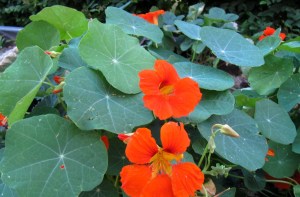 Der Kopfsalat ist verbrannt, vertrocknet und beginnt zu schießen. Giersch ist zäh wie Leder. Doch die Kapuzinerkresse sprießt und blüht in fröhlichen Büscheln. Es gibt eine ganze Reihe von verschiedenen Kapuzinerkressen. Das was ich säe und ernte ist die Große Kapuzinerkresse (Tropaeolum majus). Ursprünglich stammt Kapuzinierkresse aus Mittel- und Südamerika. Dort wächst sie mehrjährig. In Deutschland übersteht sie meist den Winter nicht und muss neu ausgesät werden. Andererseits sind die Pflanzen anspruchslos und hitzeverträglich.