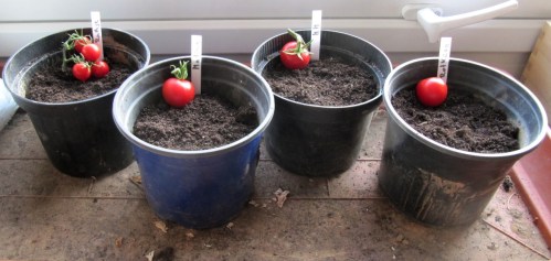 Jetzt ist es höchste Zeit, das Experiment vom letzten Jahr auf ernsthaftere Weise zu wiederholen. Bei dem trockenen Wetter der letzten Wochen, ist es ein Leichtes eingetrocknete Erde zu finden, die ich auf vier große Blumentöpfe verteile. Als oberste Schichte streue ich ebenfalls eingetrocknete Aussaaterde in die Töpfe. Damit ich im nächsten Jahr weiß, was in welchem Topf wächst, bringe ich als erstes ein Schild an und hole dann für jeden Topf eine Tomate aus dem Garten. Ich habe mich bisher wenig damit beschäftigt Saatgut selbst zu gewinnen. Ich meine gelesen zu haben, dass dafür eine der ersten und kräftigsten Früchte verwendet werden soll. Dies habe ich verpasst, aber ich werde es trotzdem ausprobieren. In diesem Jahr sind in meinem Garten fast alle Früchte recht klein. Bei den Äpfeln ist es sehr auffällig, aber auch die Tomatensorte Matina ist kleiner als sonst. Ich vermute, dass es am wenigen Regen liegt. Die Pflanzen hatten zu wenig Wasser. Ich bin gespannt, ob sich dies auf die Früchte im nächsten Jahr auswirkt.