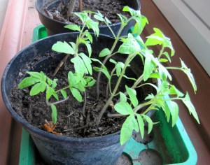 Vor etwa ziemlich genau einem Jahr hatte ich in der Gartensendung Querbeet den Tipp entdeckt, Tomatensamen auf Servietten oder Zewa-Tüchern eintrocknen zu lassen und auf diese Weise eigene Saatgutescheiben herzustellen. Ich hatte die Tomatensamen dann aber nicht auf einem Zewa-Tuch eintrocknen lassen, sondern stattdessen einen völlig vertrockneten Blumentopf genommen und eine der letzten Tomaten dort hinein zerquetscht. Leider weiß ich nicht mehr welche Sorte es genau war. Eine Kirsch- oder Cocktail-Tomate. Irgendetwas Kleines halt. Es ging mir zu dem Zeitpunkt hauptsächlich um das Experiment an sich. Der Topf stand dann den ganzen Winter auf der Fensterbank herum und es passierte nichts. Als ich im Frühjahr vorsichtig begann den Topf zu wässern, sprossen plötzlich die Tomaten-Sämlinge.
