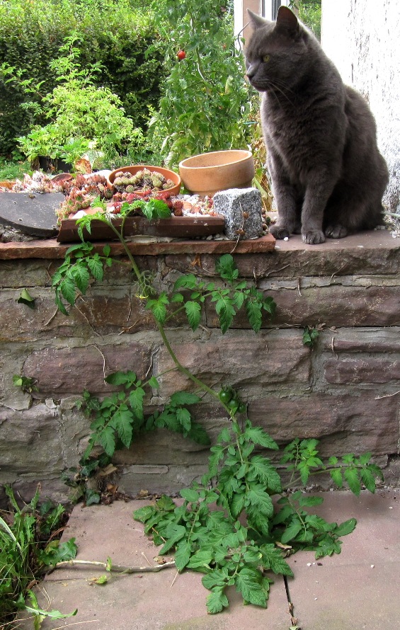 Im letzten Sommer stand auf der Terrasse ein Blumenkübel mit Tomatenpflanze. (Oder ist das dann ein Tomatenkübel?)Ich habe schon oft festgestellt, dass Tomaten sich selbst aussäen und wundere mich nicht mehr darüber an den verschiedensten Stellen des Grundstücks kleine Tomatenpflänzchen zu entdecken. Dieses Exemplar hat es aber doch geschafft mich noch zu überraschen. Zuerst fiel mir gar nicht auf, dass zwischen dem Unkraut neben der Terrasse und in den Fugen der Platten auch noch eine Tomate wächst. Mittlerweile hat sie sogar mehrere Früchte. Um sie genauer anzusehen, habe ich das Unkraut entfernt. Die Tomate wurzelt direkt neben der Terrasse. Nachdem sie sich erst auf dem Boden entlangschlängelte, hat sie dann an der kleinen Mauer Halt gefunden. Ohne je Dünger oder Wasser von mir bekommen zu haben, hat sie sich zu einer vollständigen Cocktailtomate entwickelt. Und das bei der Dürre der letzten Wochen! Von dieser Pflanze werde ich auf jeden Fall Saatgut gewinnen und sie im nächsten Jahr wieder anbauen.