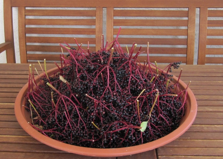 Schließlich sitze ich jedoch fast den gesamten Nachmittag und zupfe die einzelnen Beeren aus den Dolden. Dabei überlege ich mir, wie es mit meinen Holunderbüschen nach der Ernte weitergehen soll. Die Wilden dürfen gerne weiterhin bleiben, aber für den Ertrag an Beeren werde ich mich zukünftig auf den gekauften Haschberg verlassen. Am besten ich entwickele eine Arbeitsteilung. An den wilden Holunderbüschen ernte ich die Blüten für Fiebertee und Haschberg mit seinem verlässlichen Erntezeitpunkt liefert den Saft.