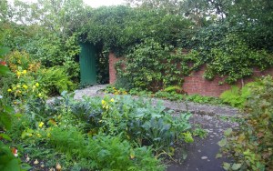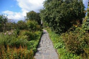Die Form dieses Staudengartens ist ungewöhnlich (sehr lang und schmal) und ich frage mich, wie er zu dieser Form gekommen ist. Vielleicht war der Eingang früher an anderer Stelle? Außerdem, wo ist das Gemüse? Bei aller Liebe für Blumen und Aquarelle war Beatrix Potter auch eine Farmerin und wird nicht auf einen Gemüsegarten verzichtet haben. Am Ende des schmalen Streifens gibt es einen, auf den ersten Blick kaum erkennbaren, Durchgang zu einem auf drei Seiten durch Mauern geschützten Gemüsegarten. Der
