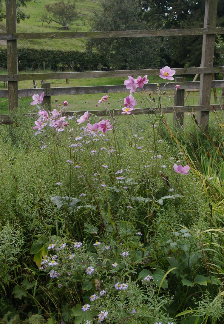 - Die Blüten der Herbstanemone tanzen auf unsichtbaren Stängeln über einem Beet aus Astern.