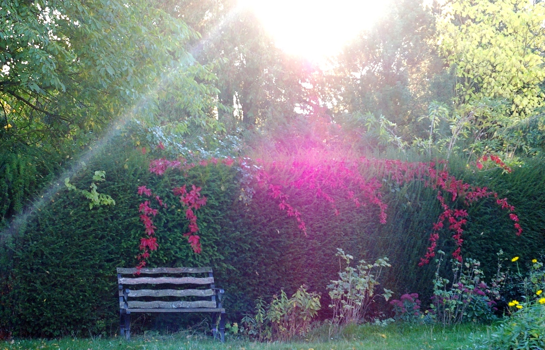 In meinem Garten begeistern mich gerade die roten Weinblätter, die vom Nachbarn herüberranken und sich wie eine Girlande zum Gartenfest durch die Eibenhecke schlängeln.
