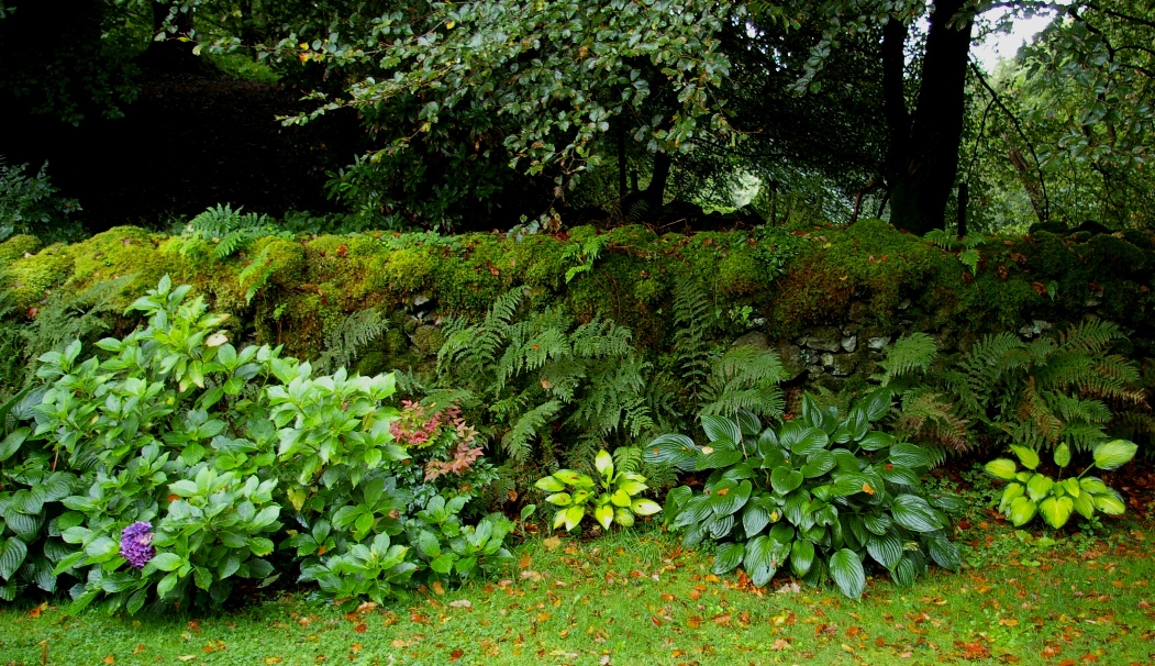 An einer Stelle ist zum Beispiel sehr schön zu sehen, wie eine Rasenfläche von Hortensien begrenzt ist. Je schattiger die Rasenfläche ist, desto mehr Funkien mischen sich zwischen die Hortensien, bis schließlich in der dunkelsten Ecke ein ganzer Funkiengarten gestaltet wurde. Für einen normalen Privatgarten wäre alleine diese eine Hortensien-Funkien-Reihe schon eine gelungene Gestaltung. In Wordsworths Garten, der ja irgendwie auch ein Privatgarten ist, ist dies nur eines von zahlreichen gleichwertigen Elementen. Alles was spätere Gartendesigner sich zu dem Thema „Gartenräume“ ausgedacht haben, ist hier schon zu finden.