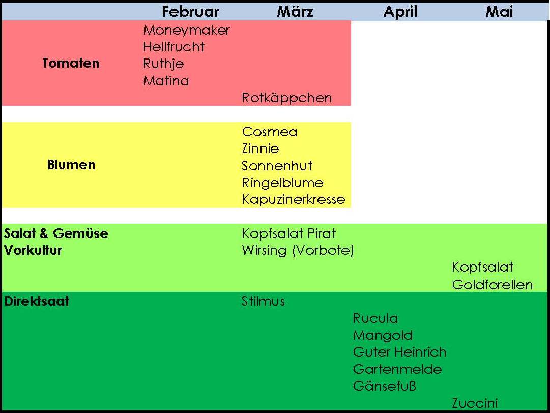 Ich mache den Aussaatplan nur noch für die erste Jahreshälfte. Was danach kommt, lasse ich auf mich zukommen. Wenn es Platz im Beet gibt, schaue ich welches Saatgut zu Beet und Wetter passt. Für die Monate Juli bis Oktober kommt das Stichwort Spontansaat in den Plan. Gibt es etwas das sich im November / Dezember noch säen lässt? Wer weiß, vielleicht gibt es selbst das.
