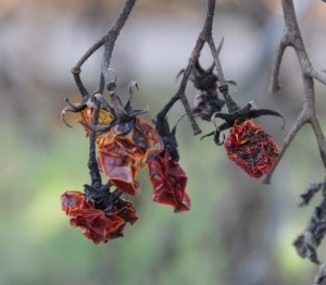 An zwei Pflanzen, die seit letztem Herbst im Freiland stehen habe ich noch rote Früchte entdeckt: Eine Cocktailtomate Ruthje, die ich selbst gezogen hatte und eine Wildtomate, die ich geschenkt bekam. Die Cocktailtomaten sind völlig verschrumpelt und ausgetrocknet. Die Wildtomaten sehen noch ganz normal aus. Winzig, ja, aber ansonsten vollständig intakt. Beides packe ich in kleine Töpfe mit Anzuchterde und warte. Die Wildtomaten zerquetsche ich etwas. Die Cocktailtomate ist so vertrocknet, dass ich sie nehme, wie sie ist.