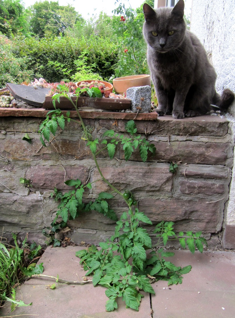 • Die Fotos gibt es natürlich. Leider lässt es sich nicht in den Kommentar einfügen. Ich habe jetzt eines der Fotos in den Beitrag eingefügt. Die Tomate muss direkt vor den Terrassenplatten wurzeln, schlängelt sich über die Platten und rankt dann an einer kleinen Trennmauer empor. Auch der Kater schaut sich das ganz verwundert an. Eine zweite Pflanze hatte sich tatsächlich zwischen den Fugen der Platten rund um den Komposthaufen ausgesät.