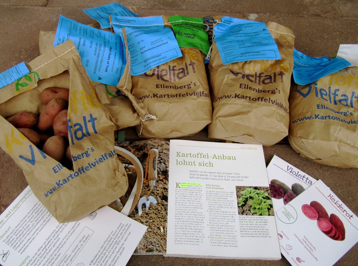 Heute Morgen hat mir endlich die Postbotin ein überraschend kleines, aber recht schweres Päckchen in die Hand gedrückt. Yeaah, meine Kartoffel sind da! Jetzt kann es losgehen! Ich suche alle Kartoffelpflanztipps zusammen. Dankenswerterweise liegt der Sendung eine Karte mit den wesentlichen Infos bei. So klein das Päckchen auch ist, in jeder Tüte sind ganz schön viele Kartoffeln. Vielleicht doch die Wiese in einen Kartoffelacker verwandeln? Mal sehen. Eher werde ich ein paar Interessenten für einzelne der bunten Kartoffel suchen. Oder auf dem Pflanzenmarkt vorgezogene Kartoffeln verkaufen?
