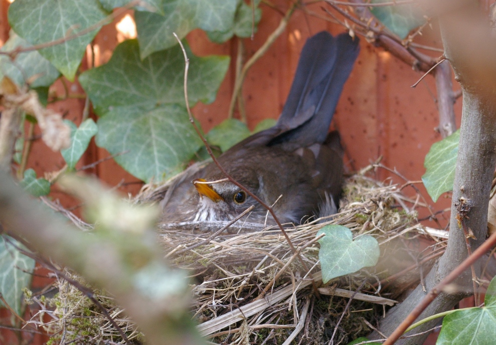 Alle paar Tage wieder schleiche ich mich an das Heckennest. Meist sitzt die Amsel ängstlich blickend im Nest. Sobald ich mich nähere, duckt sie sich noch tiefer in ihr Nest. Ich gehe dann schnell weg, um sie nicht zu stören oder gar ganz zu verschrecken.