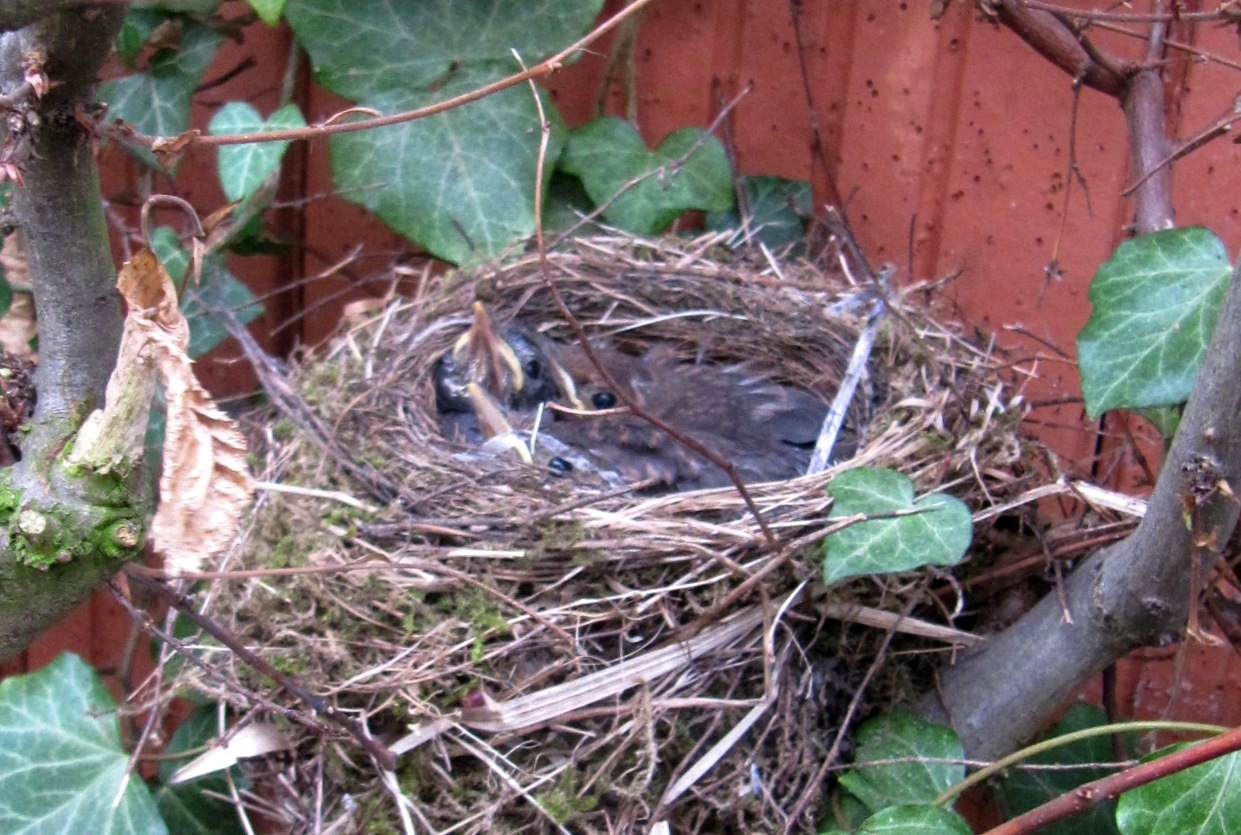 Heute hatte ich gar nicht vor, nach ihr zu schauen. Als ich vom Brötchenholen kam, sah ich eine Amsel aus der Hecke herausfliegen. Ungefähr an der Stelle an der das Nest ist. Das wird doch nicht „meine“ Amsel sein? Und es war meine Amsel! Ich wage einen vorsichtigen Blick durch die Hecke. Ich hatte erwartet, dass Eier im Nest liegen. Doch die Amsel war schneller als ich dachte. Die erste Brut für dieses Jahr ist schon geschlüpft und sitzt hungrig im Nest.
