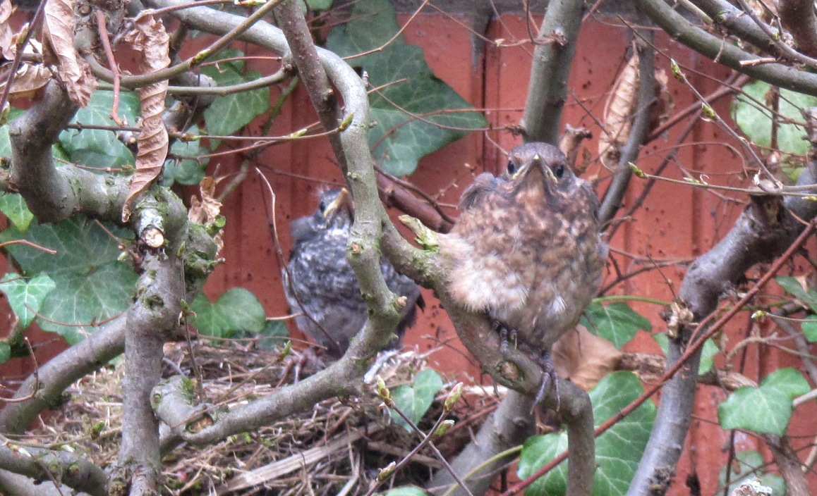 Vom Küchenfenster aus sehe ich, wie irgendetwas in der Hecke herumhüpft. Gleichzeitig fliegen ganz eindeutig zwei Amseln aus der Hecke heraus – und es hüpft immer noch. Das sehe ich mir genauer an. Tatsächlich, die Amseljungen verlassen gerade zum ersten Mal das Nest! Unglaublich, wie schnell sich so ein Amselkind entwickelt. Vor ein paar Tagen hatte sie zwar auch schon erste Federn. Aber in so kurzer Zeit vom Nestling zum Heckenhüpfer, Wow!, das hätte ich nicht gedacht.
