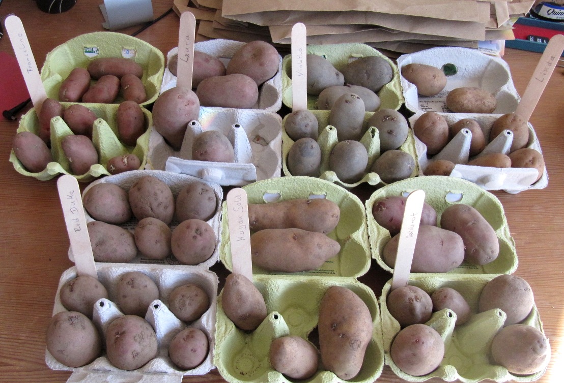 Ich bau die Kartoffeln auch im Topf an, aber nicht wegen dem Wetter oder so, sondern weil ich die „Blauen St. Galler“ wenn sie erntereif sind im Boden fast nicht finde. Sie sehen dann auch wie Erdbrocken und so dunkel wie die Schale ist sind viele drin geblieben. War schade drum. Jetzt kann ich dann im Spätsommer den Topf über dem Kompostsieb in die Schubkarre kippen. Kartoffeln rauslesen, was durchs Sieb fällt wächst dann gleich im kommenden Jahr *hoffentlich wird das ein Permakultur-Ding *lach