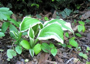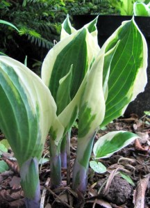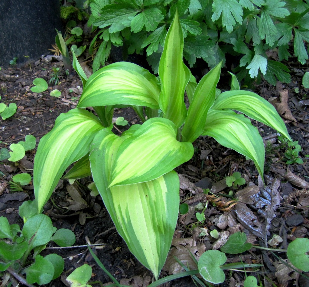 Jetzt im Frühling ist das Unkraut schneller als die Funkien. Während Gundermann und Scharbockskraut die Fläche unter sich aufteilen ist von den Funkien noch nichts zu sehen. Selbst die zahlreichen Hainbuchsprösslinge sind anfangs größer als die ersten Triebe der Funkien. Ich muss aufpassen, die frischen Spitzen beim Rasenmähen nicht gleich wieder abzusäbeln. Bei meinen Besuchen im Funkienversteck erlebe ich mit, wie sich aus der anfangs lilafarbenen Spitze, im Laufe der nächsten Tage frischen Blätter entrollen. Wie eine Eistüte, die sich quer aufrollt.