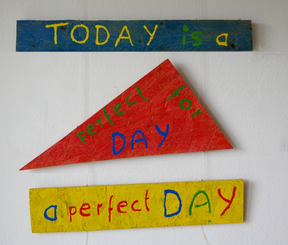 Im Wohnzimmer laufe ich – wie zig-mal täglich – an buntbeschrifteten Holzbrettern vorbei. Ich hatte den Text irgendwo im Internet gefunden und ihn aus Holzresten nachgebaut.